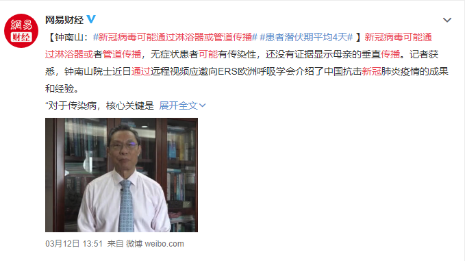 近日,鐘南山院士通過遠程視頻應(yīng)邀向ERS歐洲呼吸學(xué)會介紹了中國抗疫的成果和經(jīng)驗。鐘南山指出:“對于傳染病,核心關(guān)鍵是停止傳播。”無癥狀患者也可能具有傳染性。鐘南山還特別提醒,對于新冠病毒的傳播途徑仍需深入研究,查明是否由于淋浴器或排氣管泄露造成。