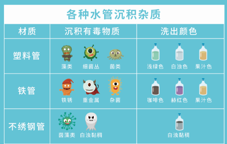 有房子的地方就有自來水管,目前我國大多數使用的是PVC管和鐵管。安裝在墻壁內的自來水管,彎曲位置多,容易藏積污垢;流速慢,污染物易沉淀。特別是晚上處于沉靜狀態,細菌及病菌將會逐漸釋放到時水中,管內水浸泡越久則細菌病菌越多。
