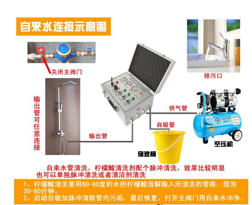 2、利用清洗機往自來水管內注入檸檬酸,對水管內壁的水垢進行軟化。