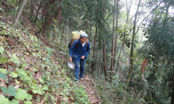 取了水的村民背著幾十斤水在陡峭的山路上行走。