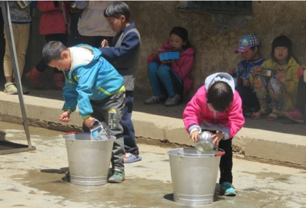 吃完午餐后的孩子用水桶里渾濁的水洗碗