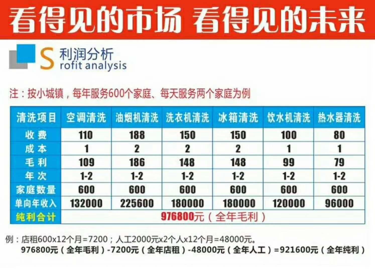 寶維家清洗服務(wù)+產(chǎn)品贈送+產(chǎn)品銷售的模式,極易讓客戶養(yǎng)成定期消費我們產(chǎn)品和服務(wù)的習(xí)慣,迅速在所在城市打開知名度,一個50萬人口的縣城,保守估計5萬個家庭,以20%家庭消費我們?nèi)盗械漠a(chǎn)品以及服務(wù)200元計算,縣級城市1年的市場份額為5萬*20%*200=200萬元。無論是客戶需要電器的保養(yǎng)產(chǎn)品或是服務(wù),都潛意識的想到寶維家,家電清洗市場發(fā)展?jié)摿薮蟆?/p>