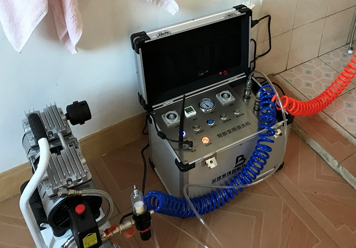 3.開始清洗:首先關閉所有龍頭及熱水器閥門,氣泵充滿氣之后打開氣泵放氣閥,此時空壓機內的壓力會進入到水管中,啟動脈沖控制系統,此時觀察工作壓力表和測試壓力表,兩個表的讀數都應該逐漸上升到8個壓左右,此時觀測壓力表數值是否穩定或者會掉壓,稍微掉一點為正常,要是短時間內表針落到底那就有問題,檢查管路或者龍頭是否關嚴或者滲漏,此過程為測漏的過程;